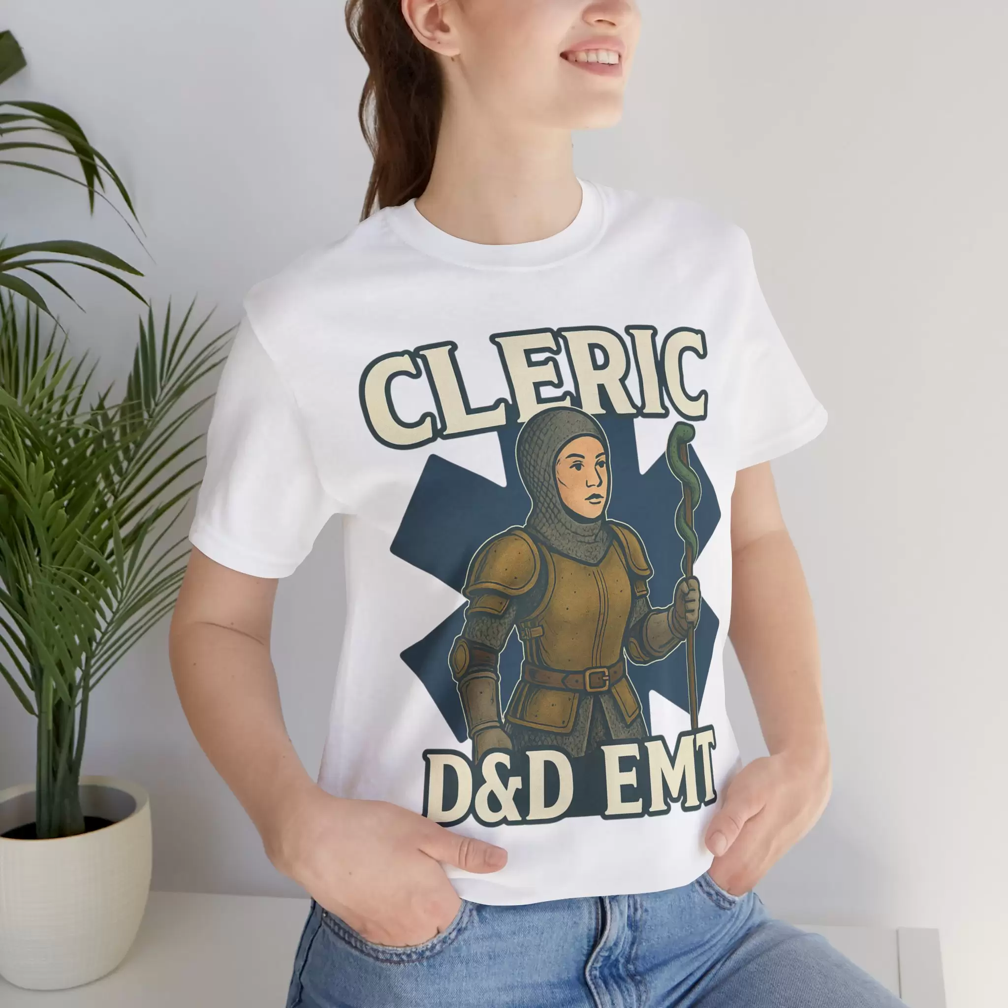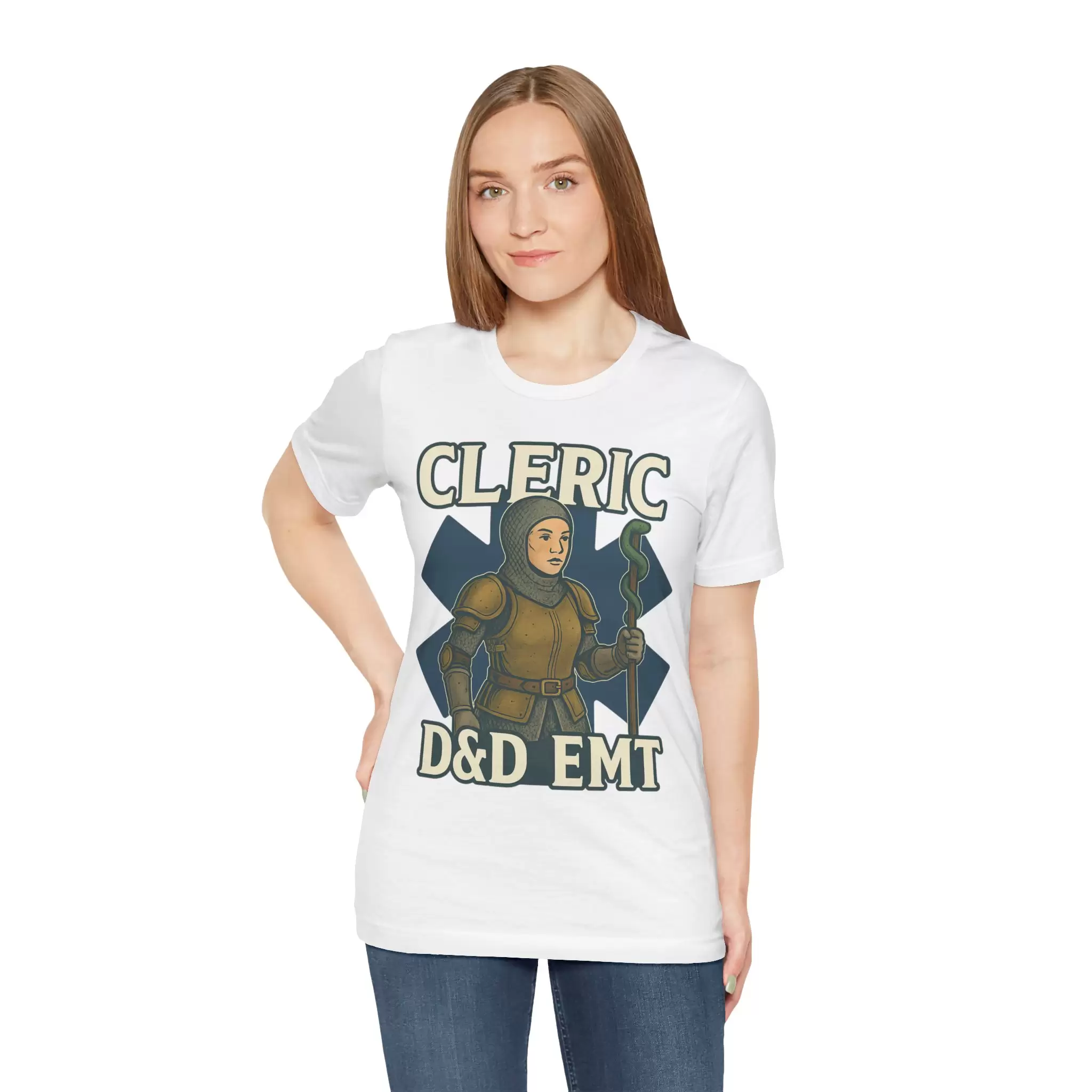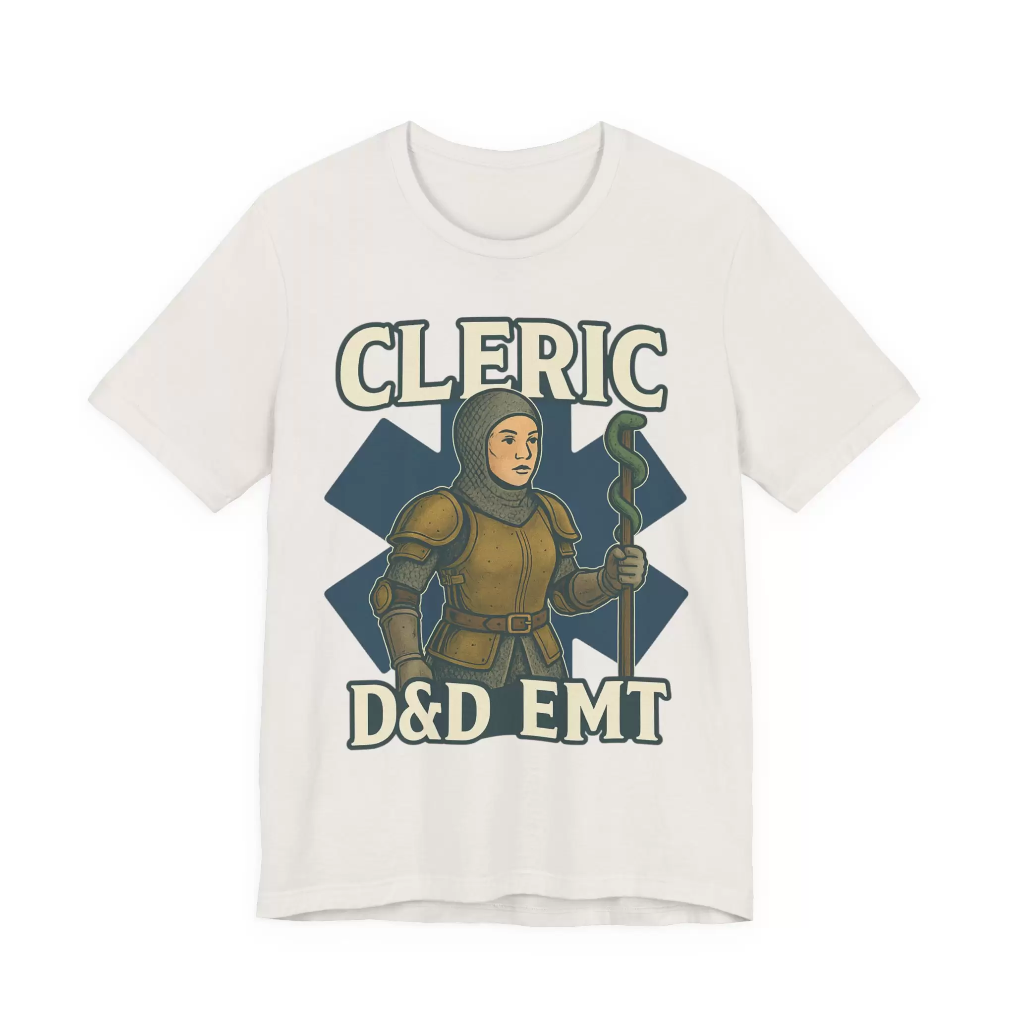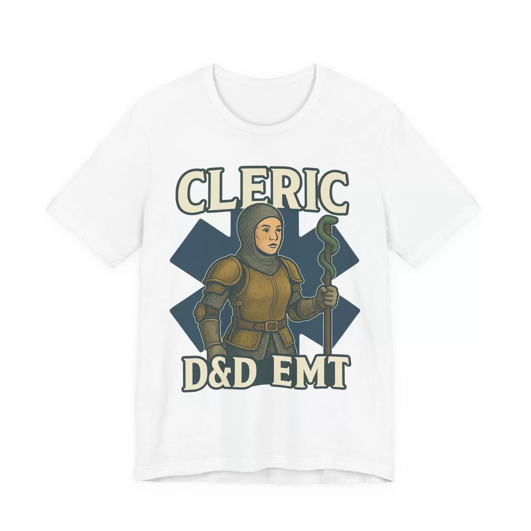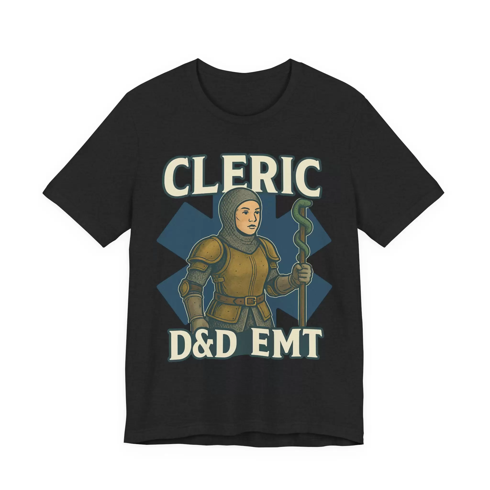 Celebrate the real-life heroes who heal with skill, heart, and a little divine intervention. This D&D EMT Cleric T-Shirt features a striking design that merges emergency medicine with fantasy roleplaying — showcasing a confident female cleric wielding a staff topped with the EMS Star of Life. Armor-clad and resolute, she stands surrounded by healing magic and arcane scrolls, ready to stabilize your party and your patients.