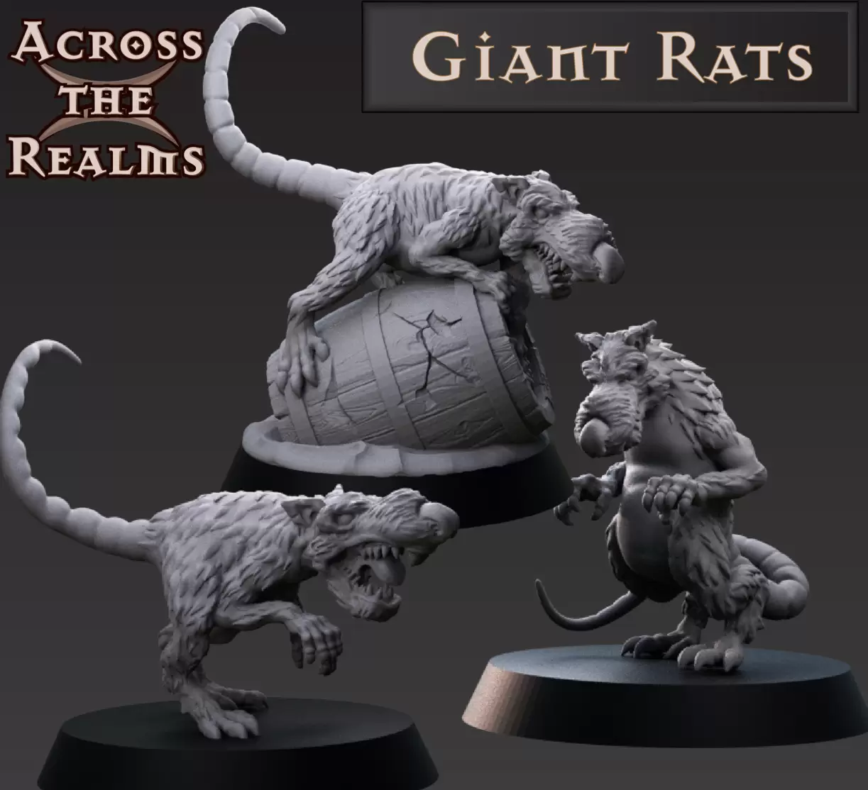 Giant Rat Miniatures (Set of 3) | Across the Realms Skittering from the shadows and into your campaign, the Giant Rat Miniatures by Across the Realms are the perfect low-level monsters to add tension, danger, and grim atmosphere to your tabletop adventures. Whether they’re lurking in the sewers, swarming dungeons, or part of a larger…