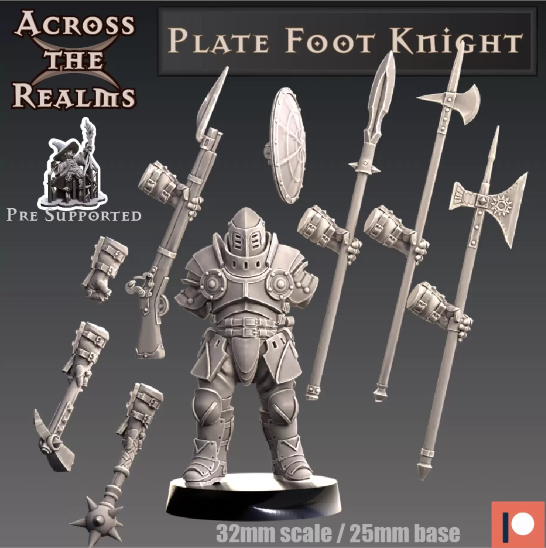 Designed by Across the Realms, this knight features modular pieces so you can customize your loadout with different weapons to fit your character or encounter. Use it as a player character, a powerful NPC, or a key unit in your fantasy wargame forces.