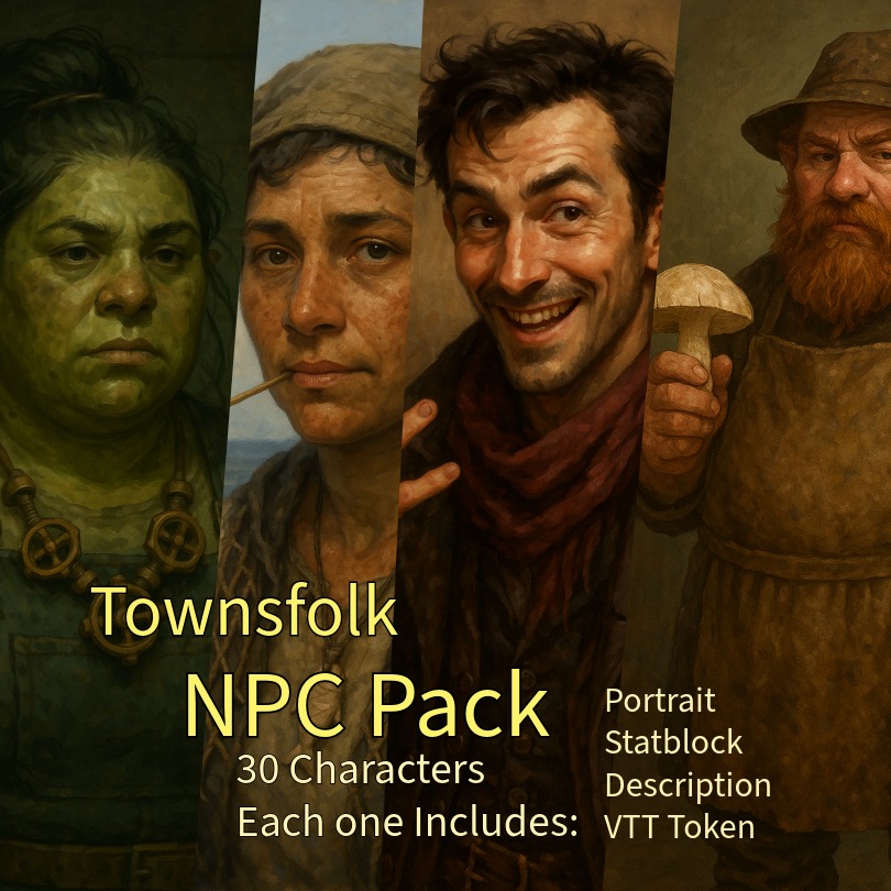 Bring your fantasy towns to life with 30 unique NPCs, each with a portrait, VTT token, 5e statblock, and rich character description. Perfect for quick drop-ins or building vibrant communities in your campaign. Includes ready-to-use files in a neatly organized ZIP.