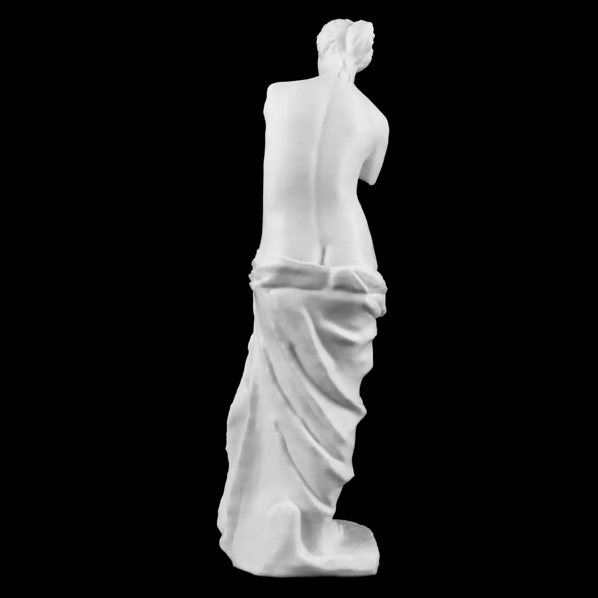 The Venus de Milo, discovered in 1820 on the Greek island of Melos, has long fascinated historians and art lovers alike. Thought to represent Aphrodite, the goddess of love, or possibly the sea goddess Amphitrite, the statue reflects a fusion of classical beauty and late Hellenistic innovation. Her serene expression, delicate form, and partially nude figure evoke timeless sensuality and divine mystery. Originally adorned with metal jewelry and painted details, the statue now survives in pure marble — or, in this case, precision 3D-printed resin.